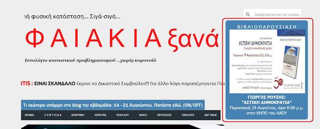 Στην ΑΡΧΙΚΗ σελίδα της ΦΑΙΑΚΙΑΣ τρέχουν κυλιόμενες μπάρες προς τα αριστερά, που περιβάλλουν τον τίτλο και που περιέχουν κατά την γνώμη μας σημαντικές ειδήσεις: